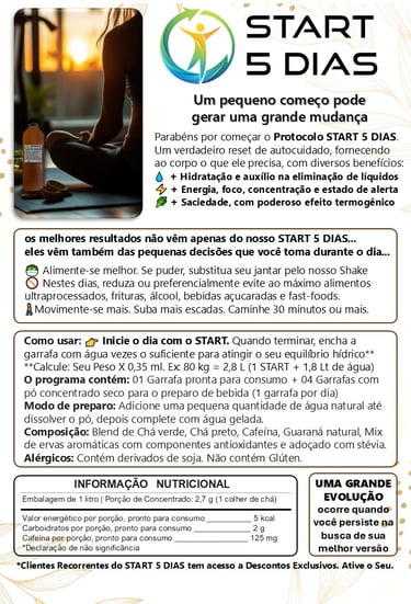 ➡️Faça a conta com o cliente para detectar a necessidade diária de água. Quantidade de quilos X 0,35 ml OU 0,40 ml (se ela estiver usando o shake). Exemplo: 100 Kg = 3,5 litros de água. 1 Litro do START + 2,5 litros de água